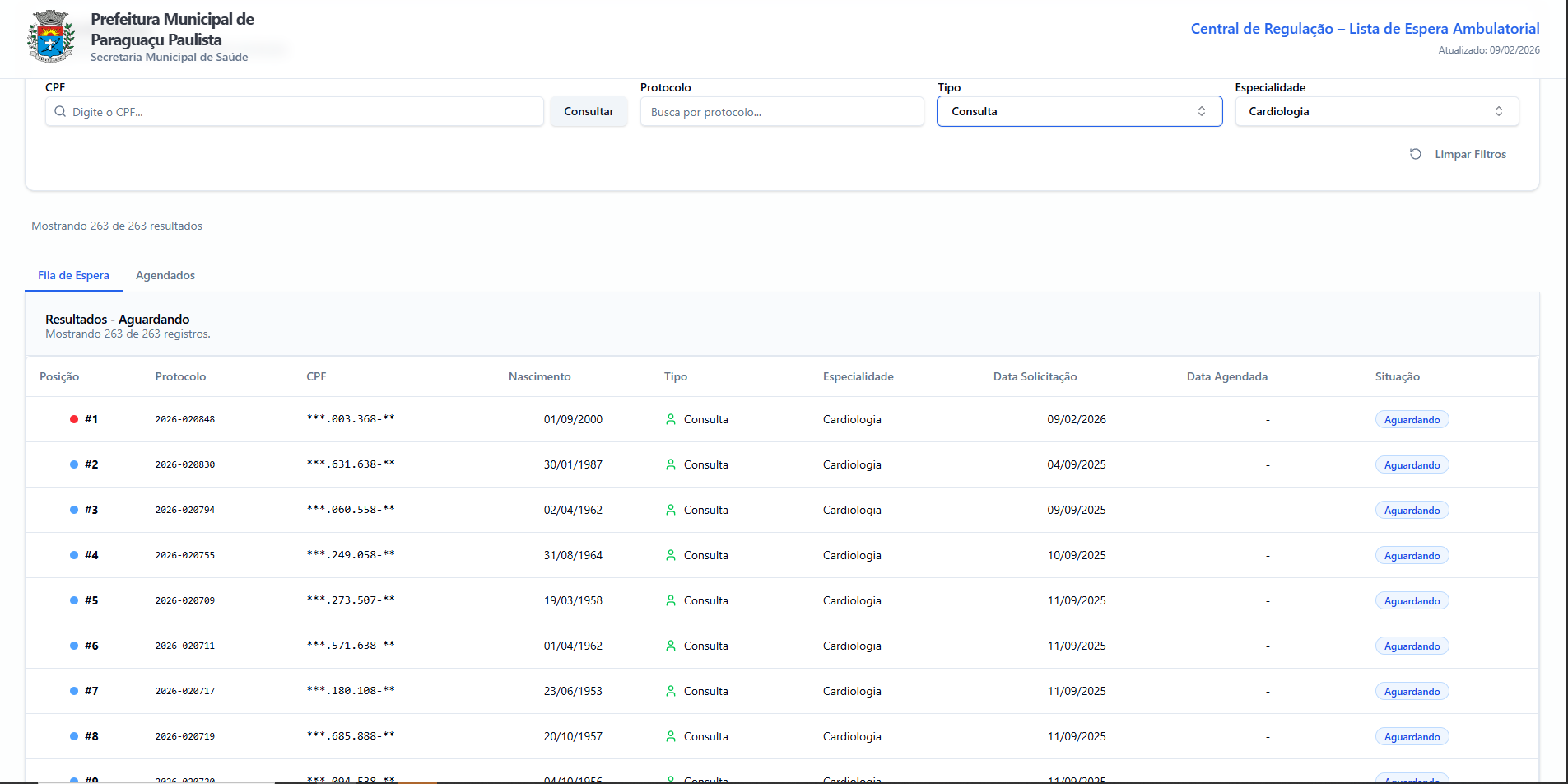 Interface pública para transparência, onde cidadãos consultam sua posição na fila em tempo real.